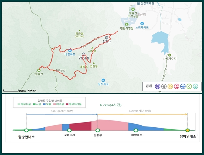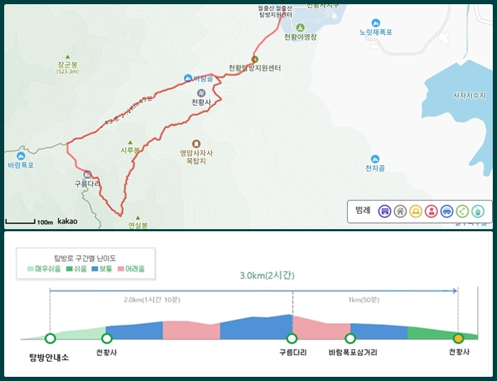 상세구간 : 월출산 국립공원탐방안내소 ▶ 천황사 ▶ 구름다리 ▶ 바람폭포 삼거리 ▶ 월출산 국립공원탐방안내소