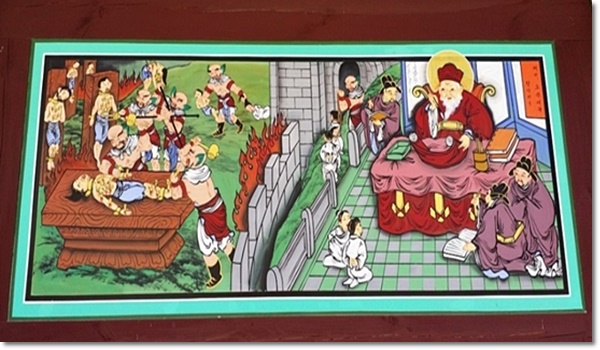 ▶ 태산대왕이 심판하는 지옥으로 통과하지 못하면 톱으로 온몸을 자르면서 고통을 주는 지옥입니다.(아래사진은 후반지옥 중 철상지옥입니다)