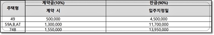 - 49 타입 주택형은 5백만 원, 59 타입 주택형은 일천삼백만 원, 74 타입 주택형은 일천오백오십만 원입니다.