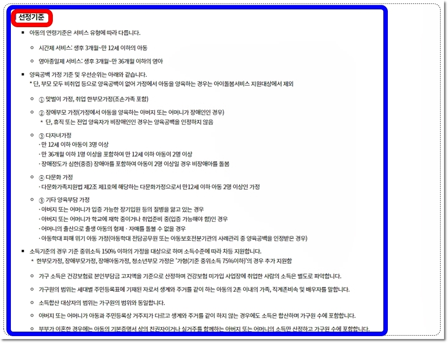 - 가구 기준중위소득 150% 이하 인 가정을 대상으로 아이 돌봄 서비스를 시행합니다.