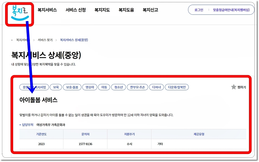 - 보다 자세한 내용은 아래 아이 돌봄 서비스 복지로 상세페이지에서 확인하시기 바랍니다.
