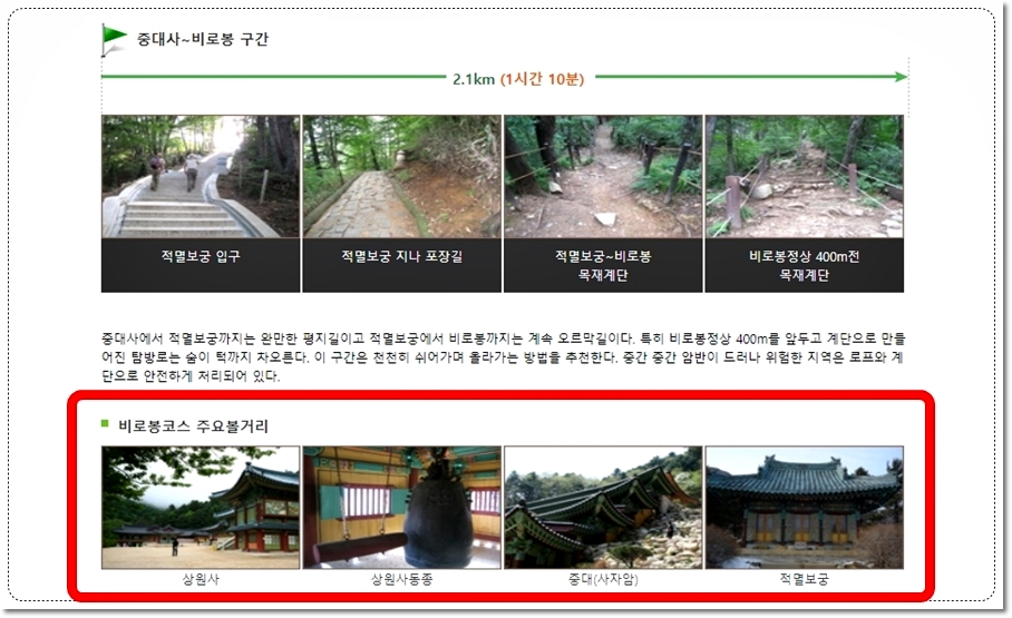 ① 오대산 최단코스 : 상원탐방지원센터 - 상원사 - 사자암 - 적멸보궁 - 비로봉 - 상원탐방지원센터 원점회귀