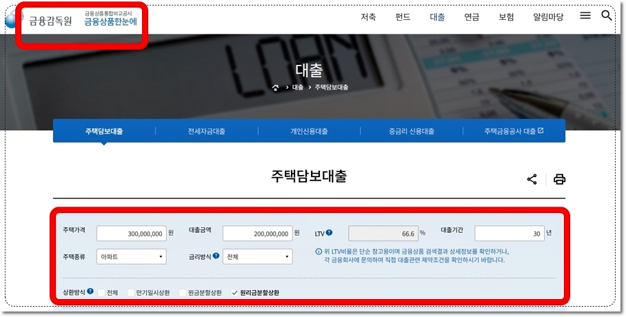 금융감독원 주택담보대출 2억 대출 시 월평균 원리금분할상환 및 낮은 금리 이자 각 은행별 알아보기
