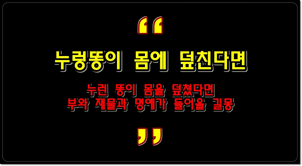 누런 똥이 몸을 덮쳤다면 부와 재물과 명예가 들어올 길몽이며 가정에 재물과 돈이 생기고 집안에 물질적인 풍요로움이 가득할 꿈입니다.
