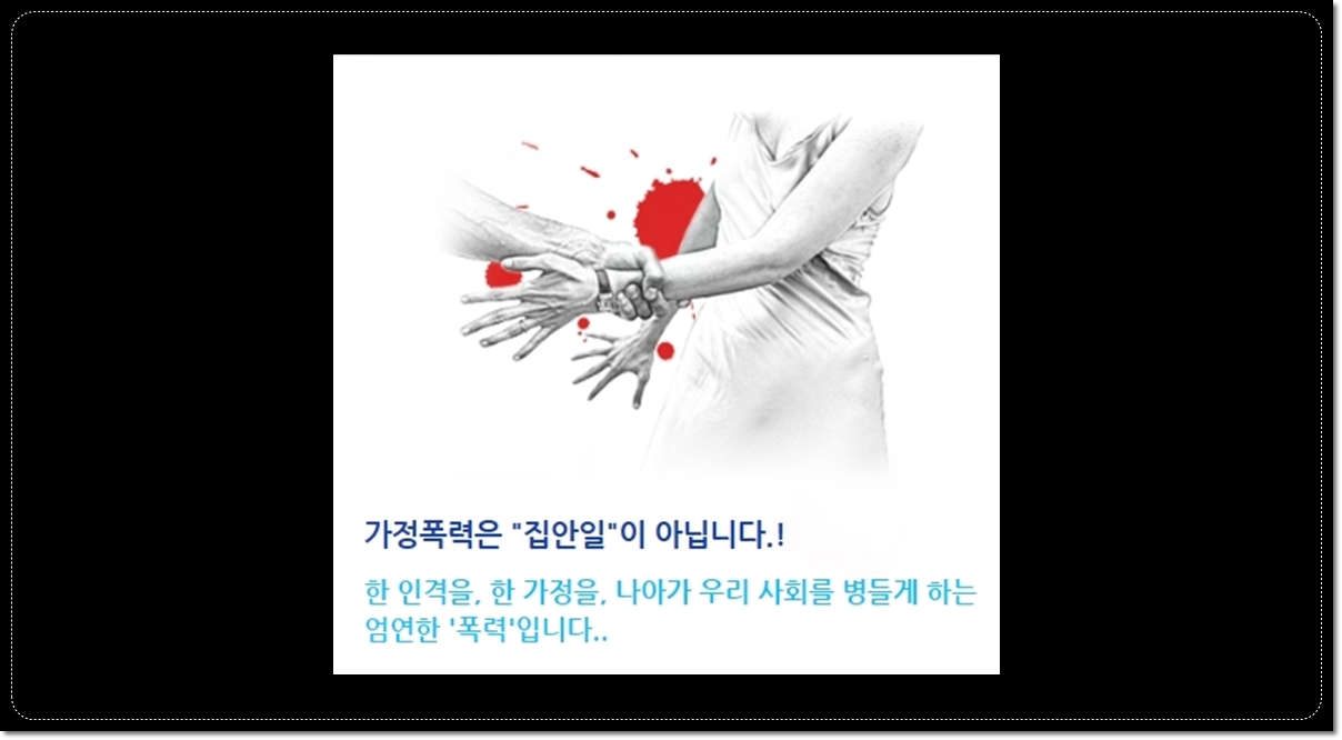 우리가 생각하고 있는 가정폭력은 이제 집안일이 아니라 사회적 문제입니다. 한 인격과 우리의 제일 편안해야 하는 가정과 나아가 우리 대한민국 사회를 병들게 하는 아주 나쁜 개인과 사회적인 폭력입니다.