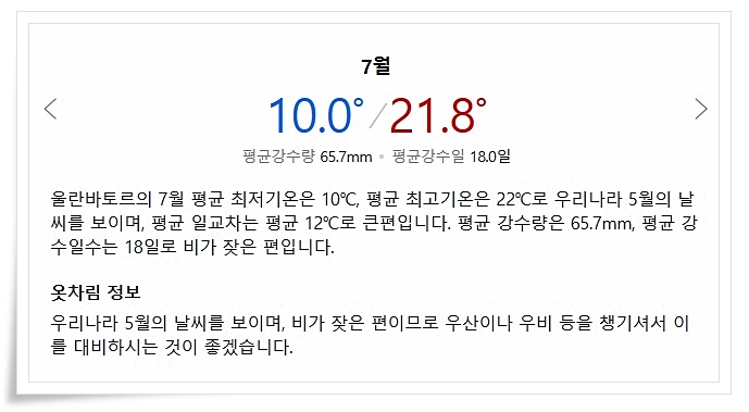 : 몽골 7월 날씨는 평균 영상 최저 약 10도에서 최고 약 21.8도입니다.