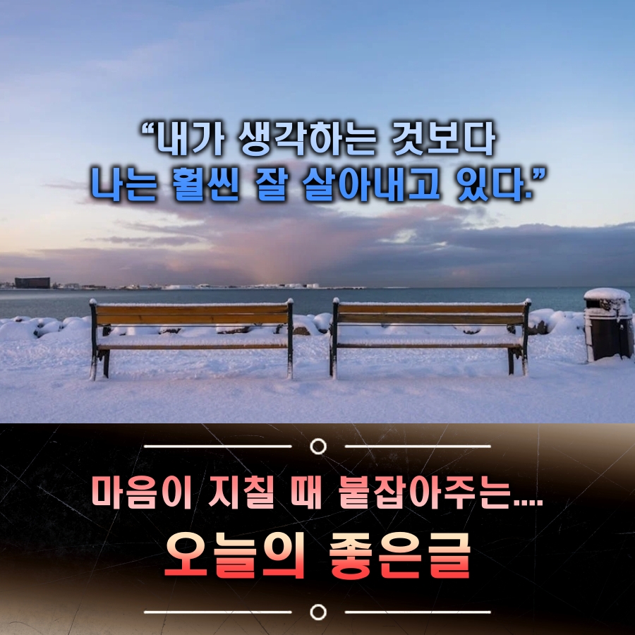 그리고 마지막 문장은 스스로에게 보이지 않던 힘을 깨닫게 하는 문장입니다. 우리는 생각보다 훨씬 잘 살아가고 있고, 생각보다 훨씬 더 많은 것을 견디며 나아가고 있습니다.
