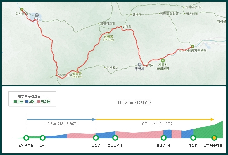 상세구간 : 갑사주차장~갑사~원효대입구~연천봉~관음봉고개~관음봉~삼불봉~남매탑~동학사~동학사주차장
