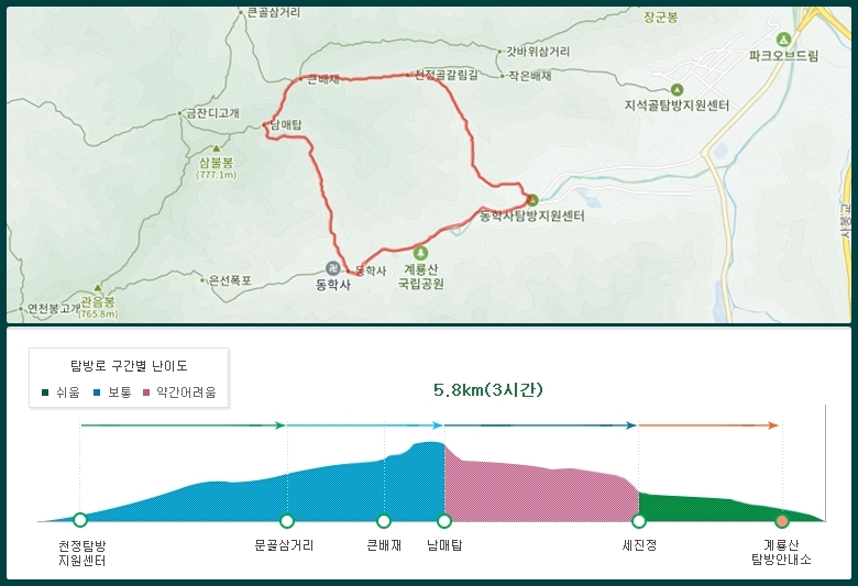 상세구간 : 동학사주차장~동학사~은선폭포~관음봉고개~연천봉~관음봉~삼불봉~남매탑~동학사~동학사주차장