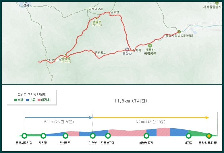 상세구간 : 동학사주차장~동학사~은선폭포~관음봉고개~연천봉~관음봉~삼불봉~남매탑~동학사~동학사주차장