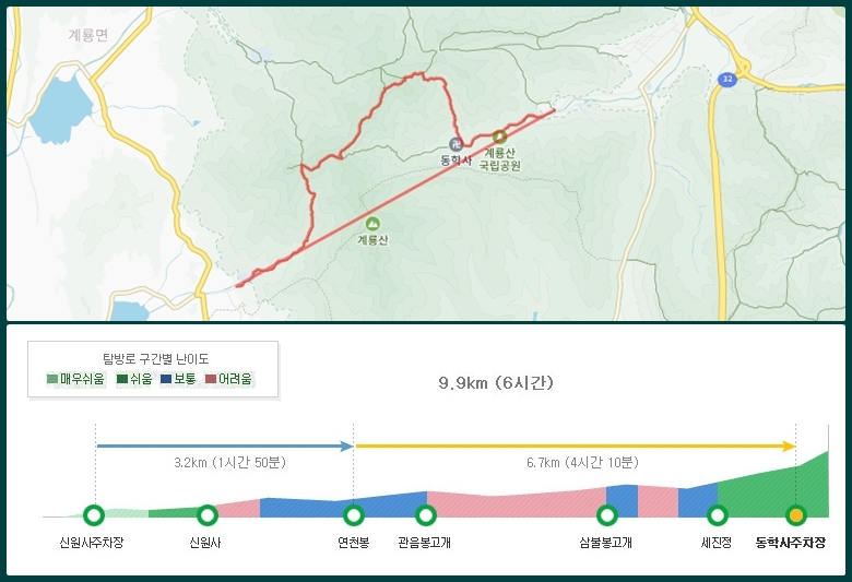 상세구간 : 신원사주차장~신원사~고왕암~연천봉고개~연천봉~관음봉~삼불봉~남매탑~동학사~동학사주차장